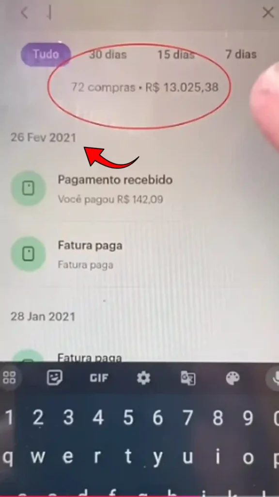 O resultado: O aplicativo filtrará todas as compras e exibirá, logo no topo, o número total de transações e o valor acumulado em reais.